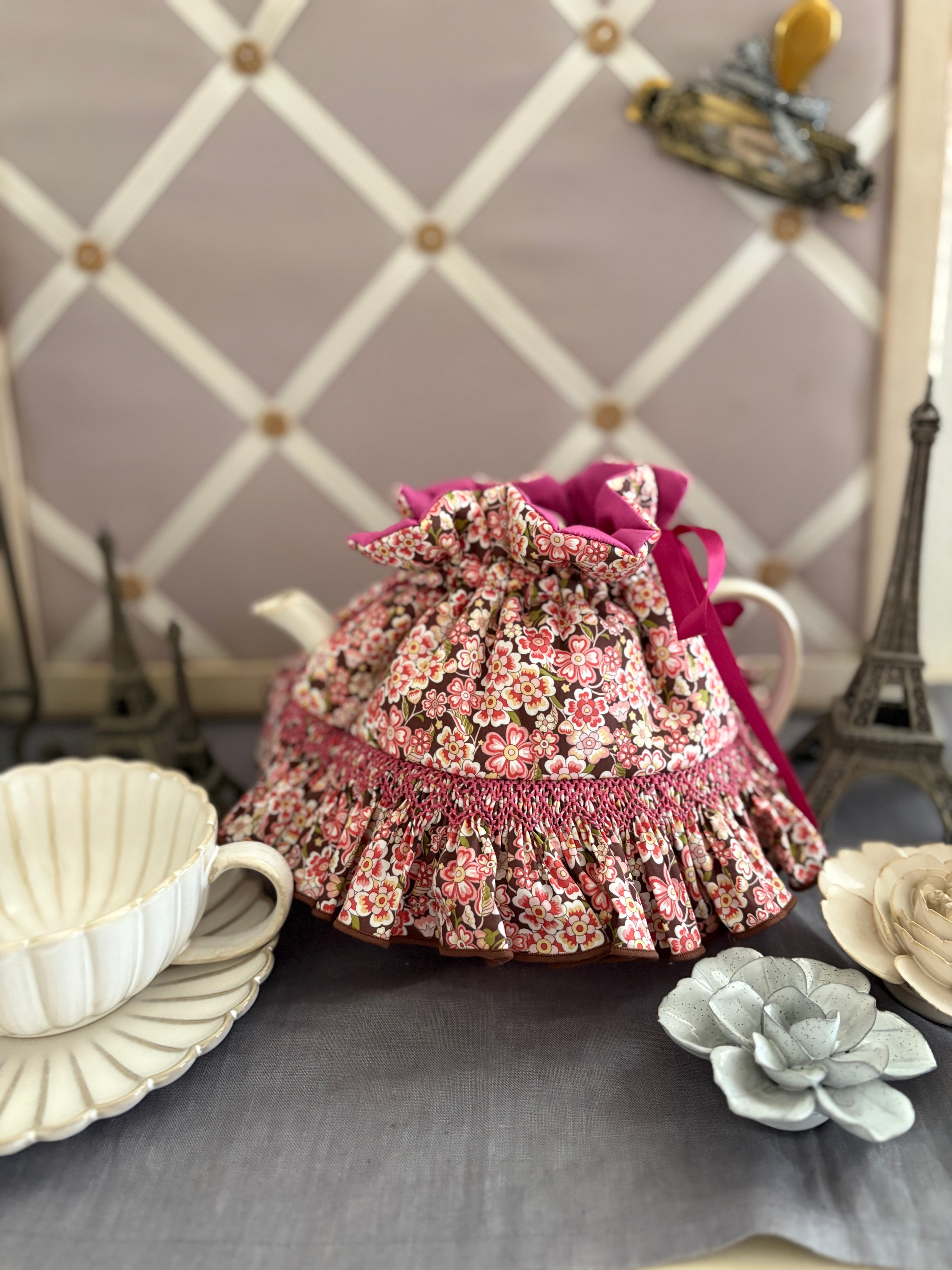 スモッキングフリルの巾着型ティーコジー リバティ アノキローズ Tea Cozy ポットウォーマー