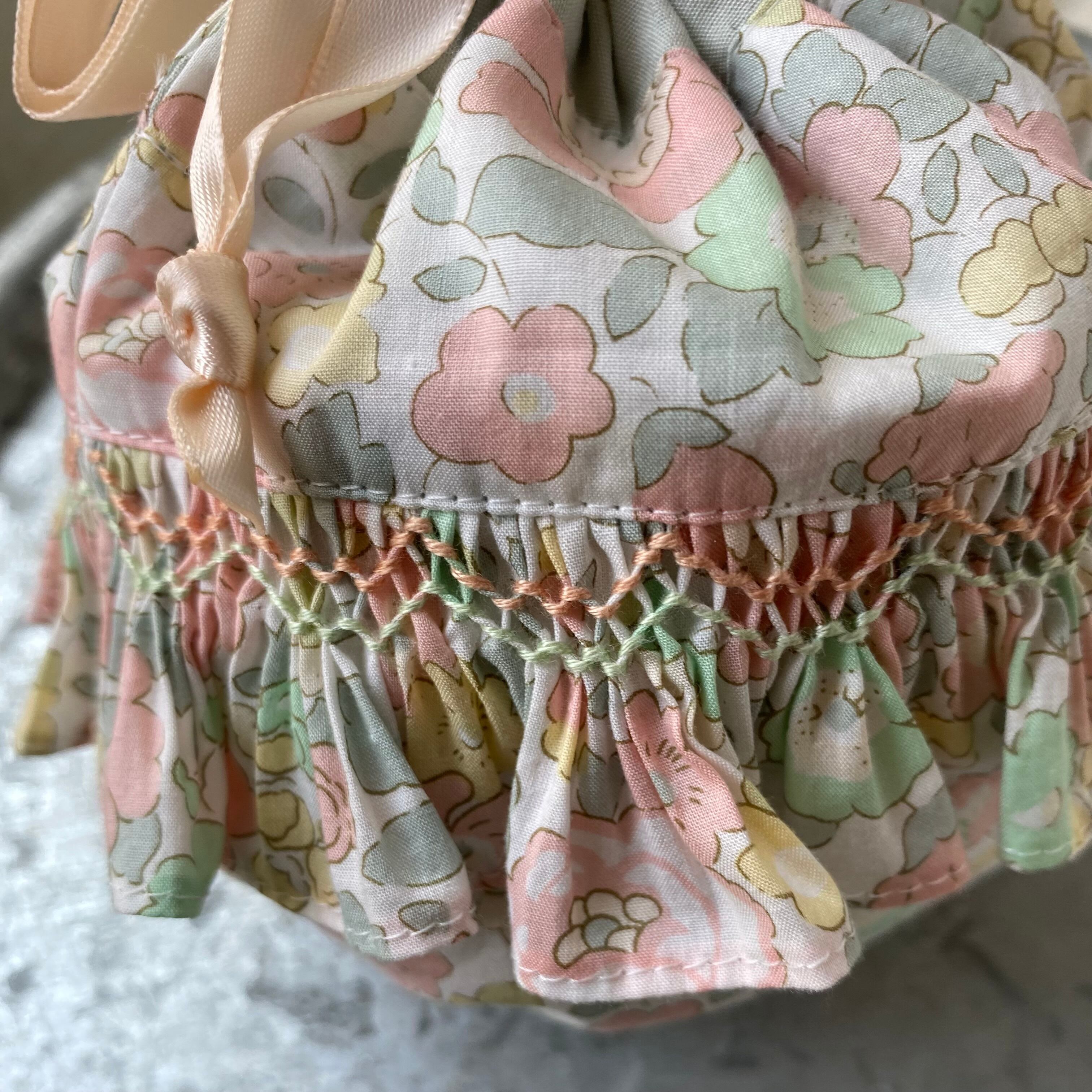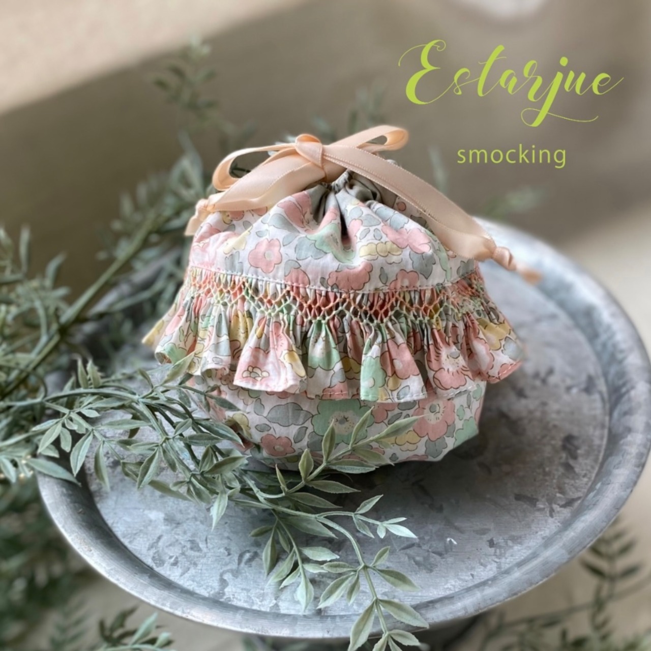 上品で華やかなリバティとひらひらとスカートの様に広がるスモッキングフリルが愛らしいまんまる巾着です。