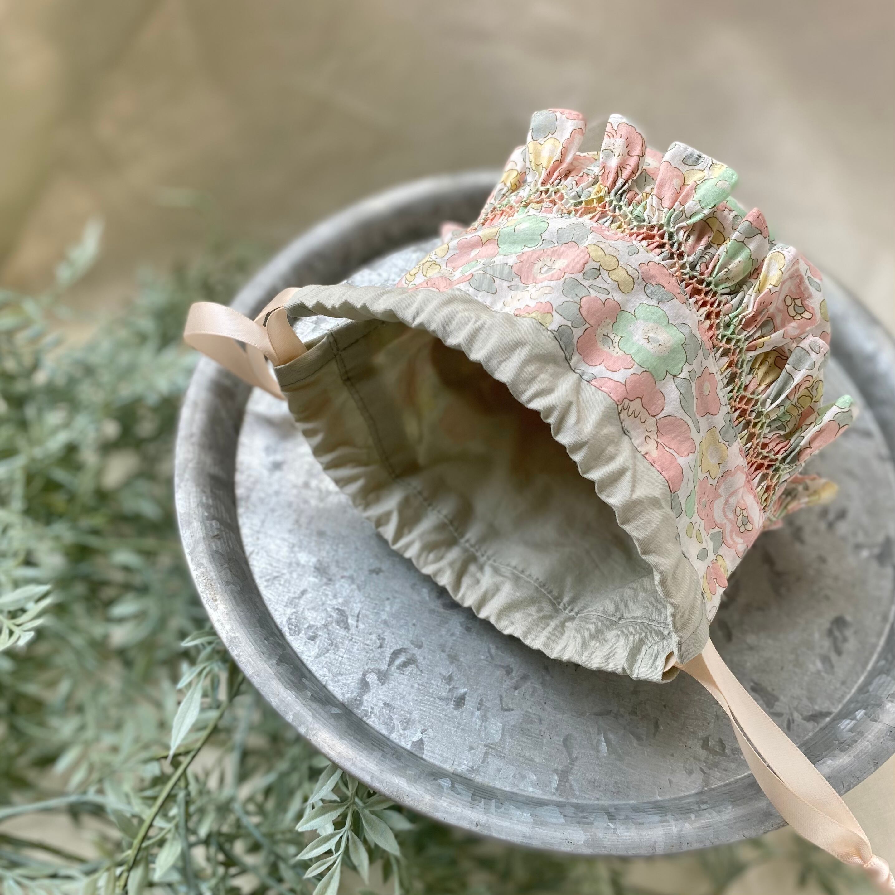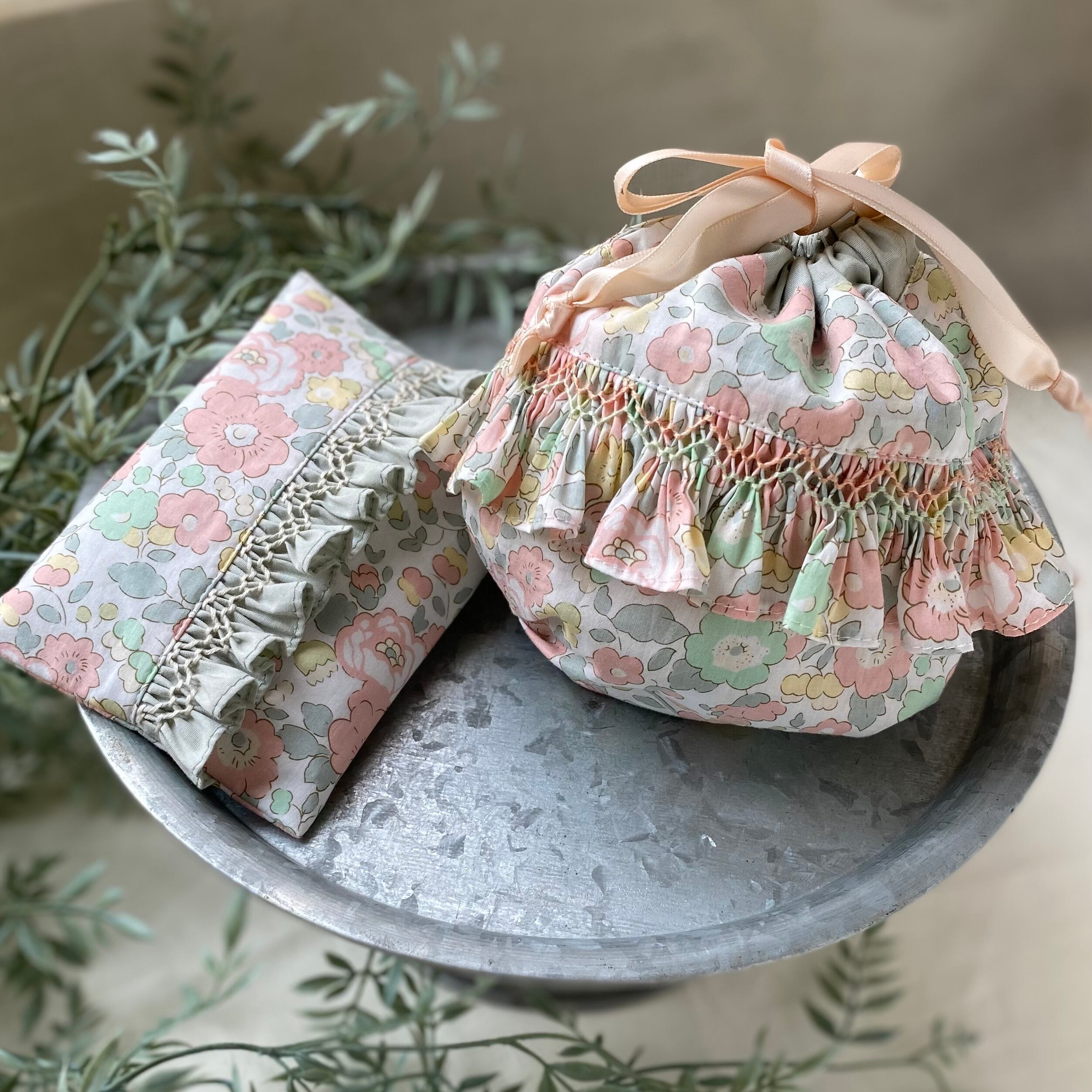 スモッキングフリルが可愛いリバティまんまる巾着【ベッツィ ペールピンク】