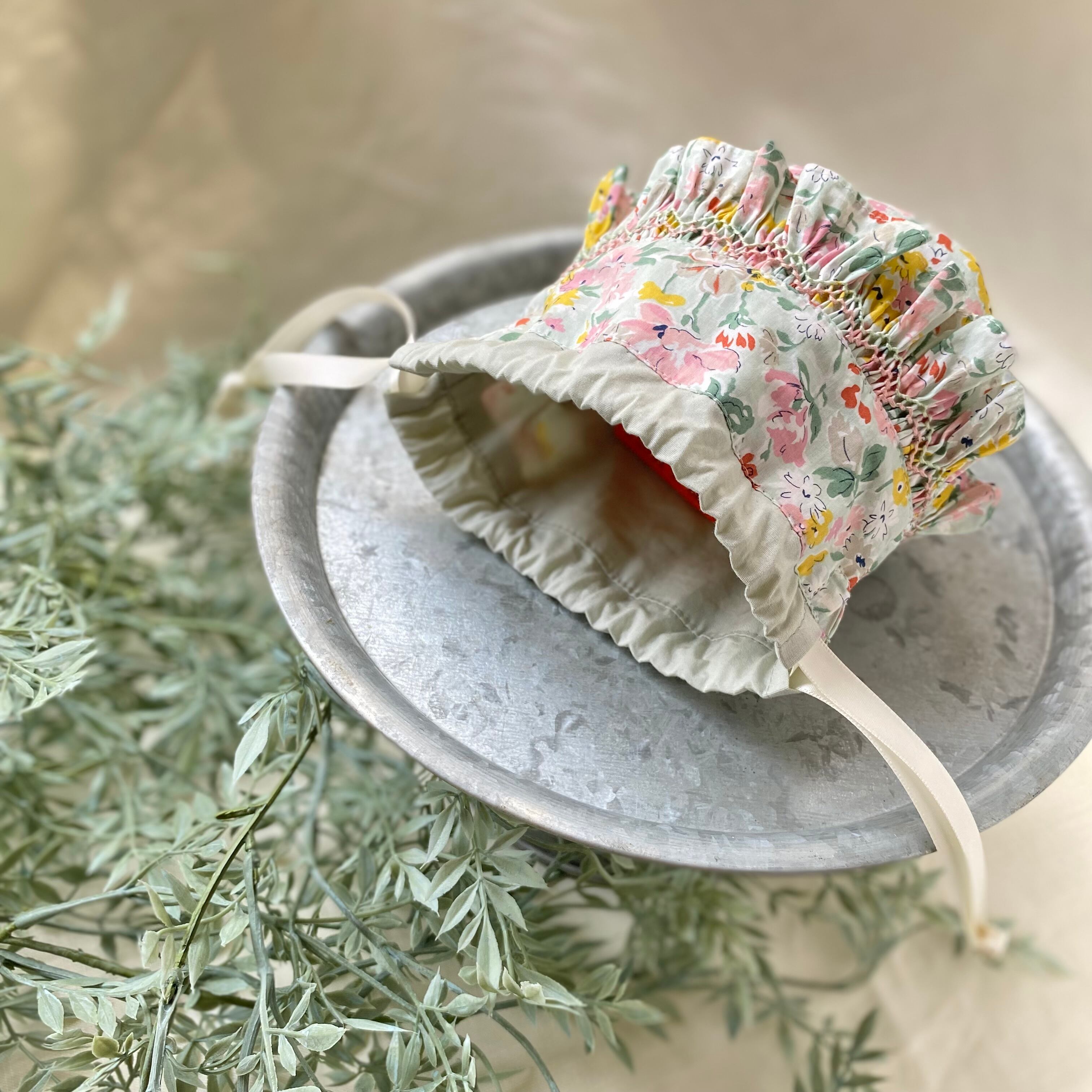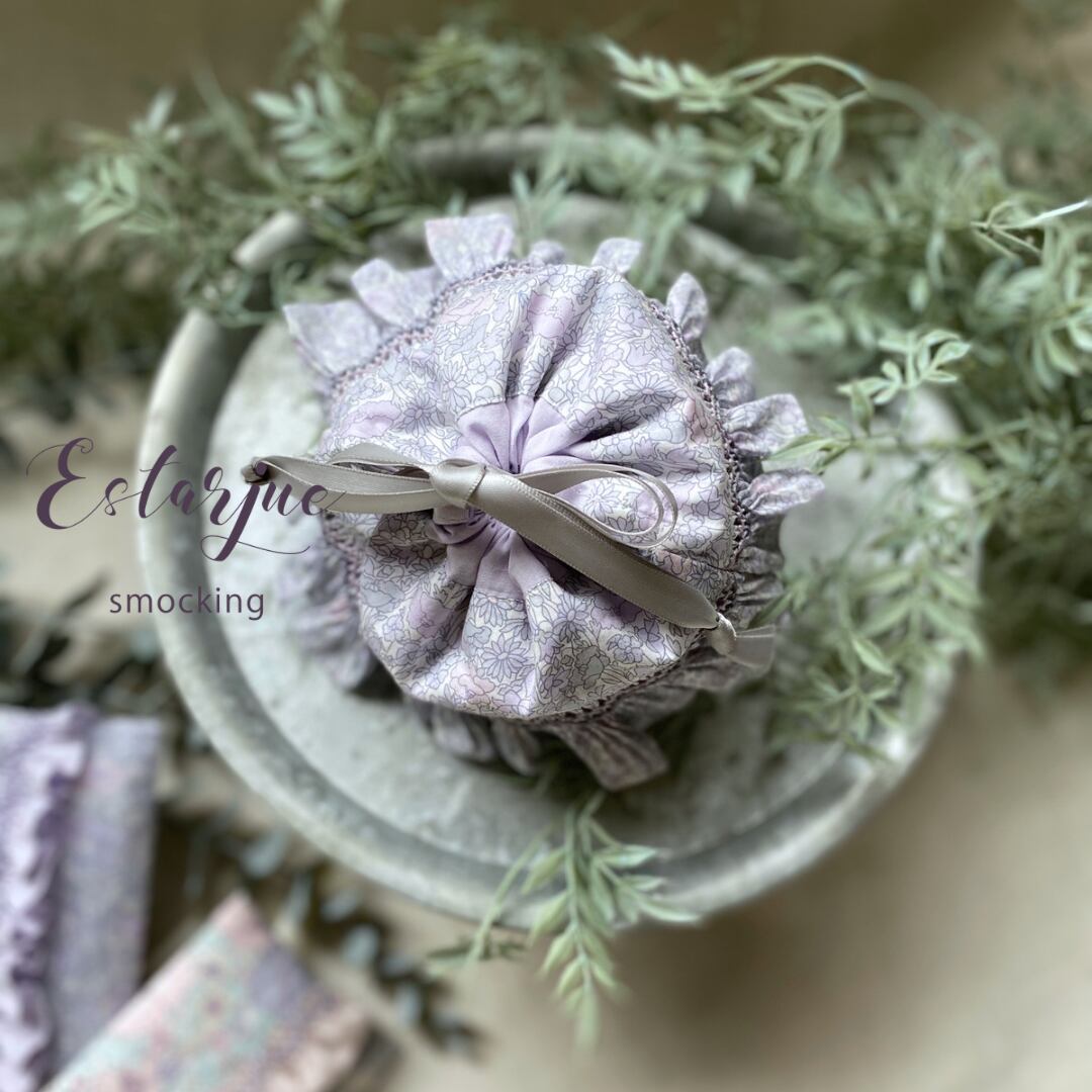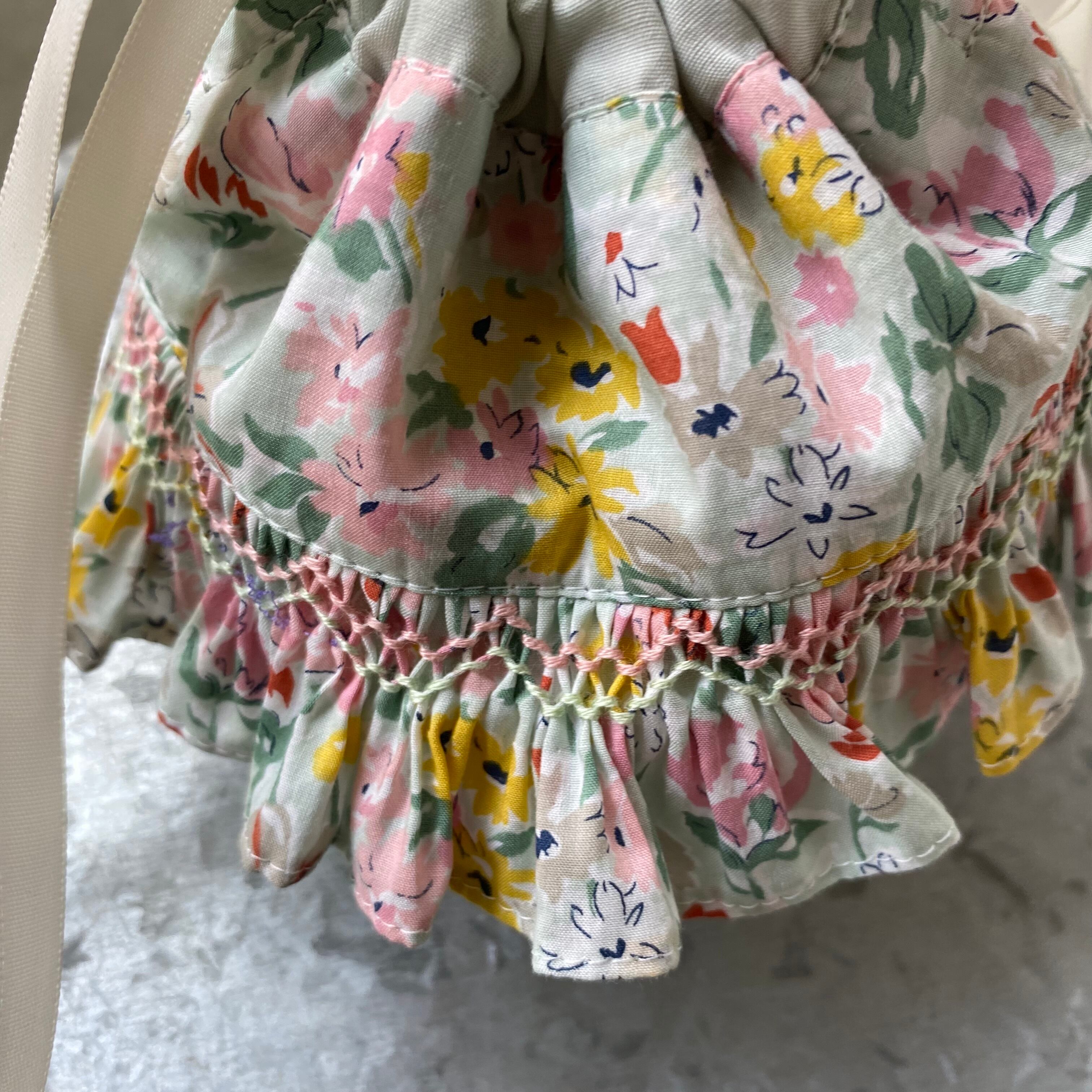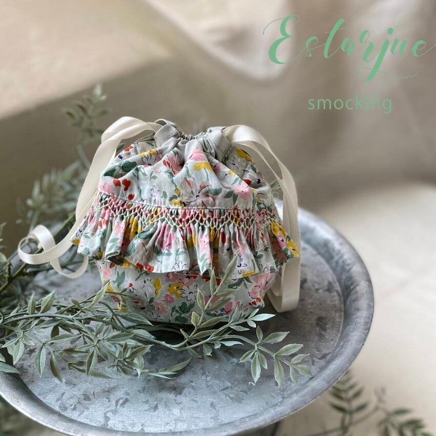 上品で華やかなリバティとひらひらとスカートの様に広がるスモッキングフリルが愛らしいまんまる巾着です。
