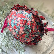 上品で華やかなリバティとひらひらとスカートの様に広がるスモッキングフリルが愛らしいまんまる巾着です。