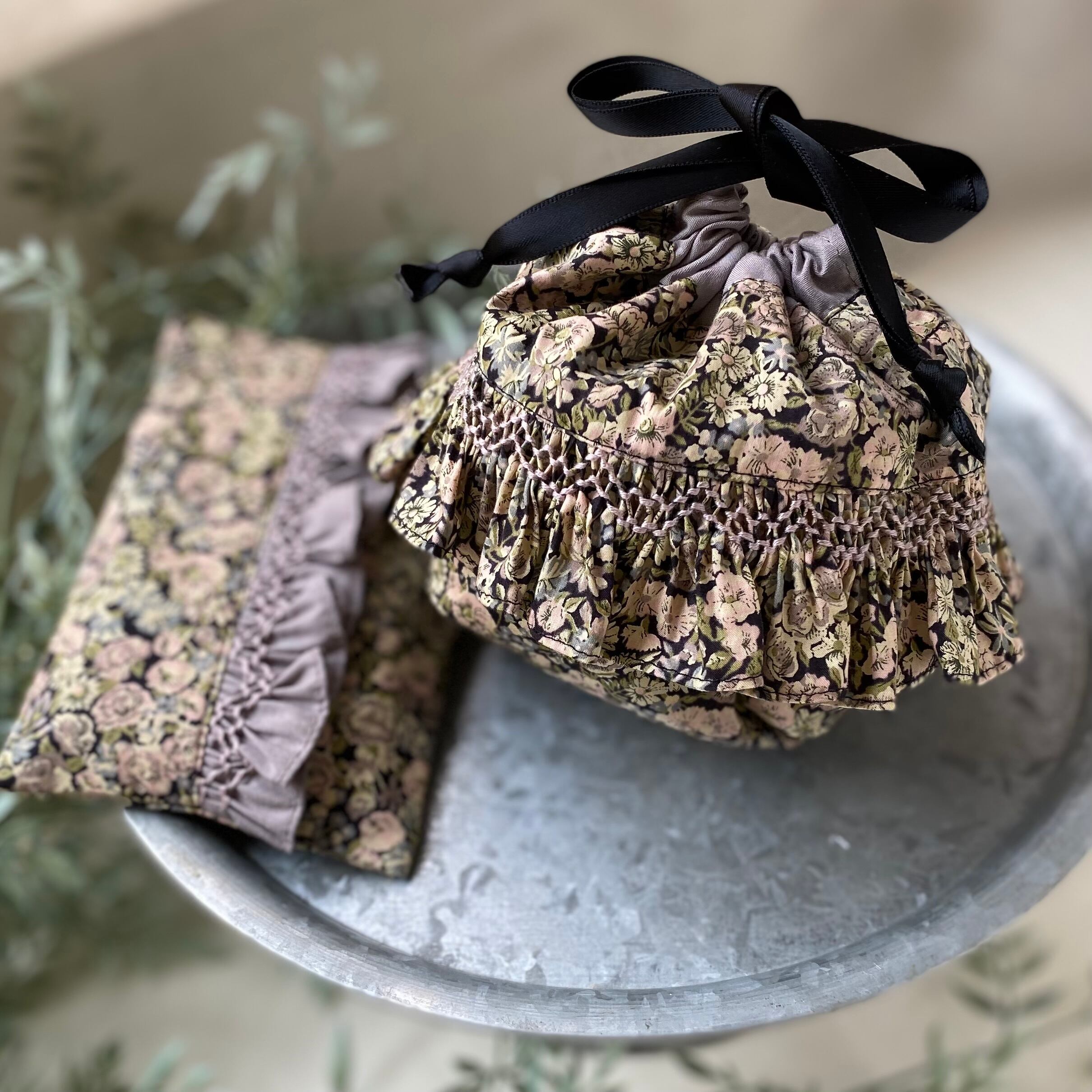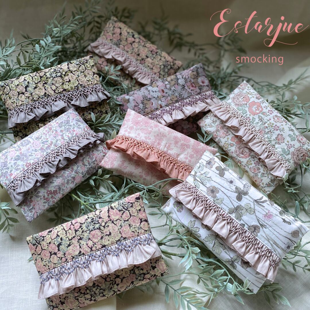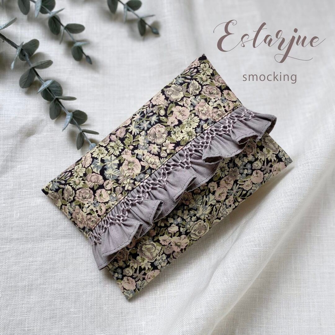 ひらひらと揺れるスモッキングフリルが可愛いアクセントになったリバティ柄のポケットティッシュケースです。