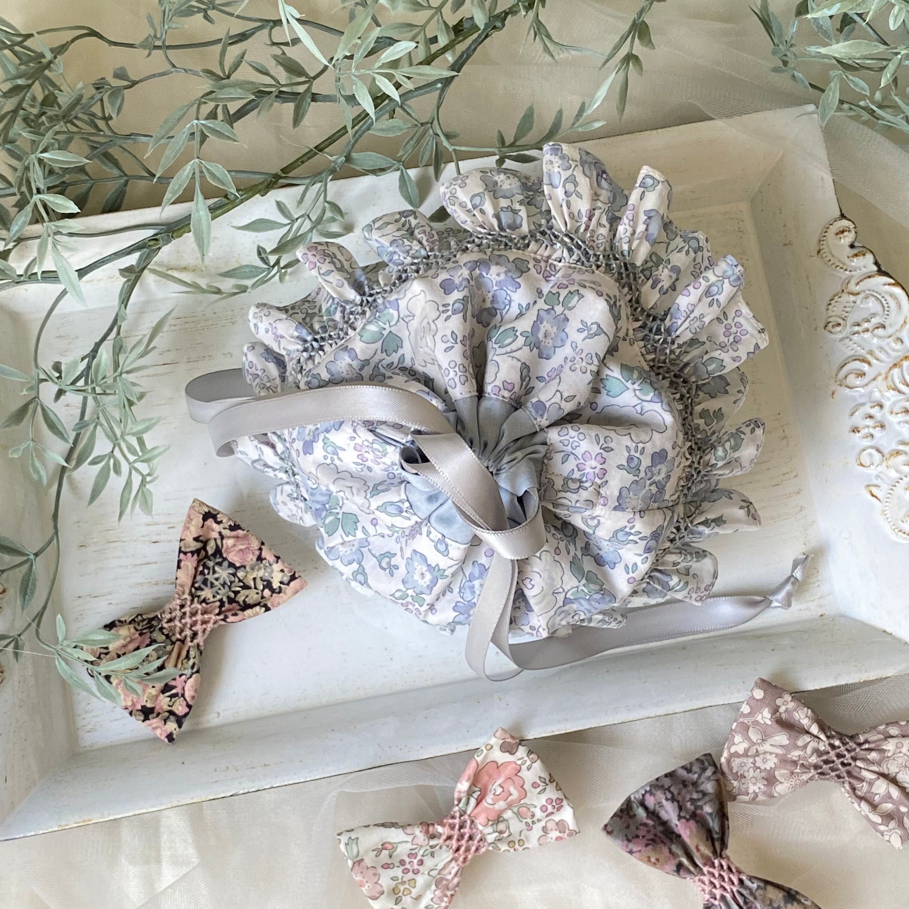 ひと針ひと針、手仕事によるスモッキング刺繍を施したリバティまんまる巾着をお楽しみください。