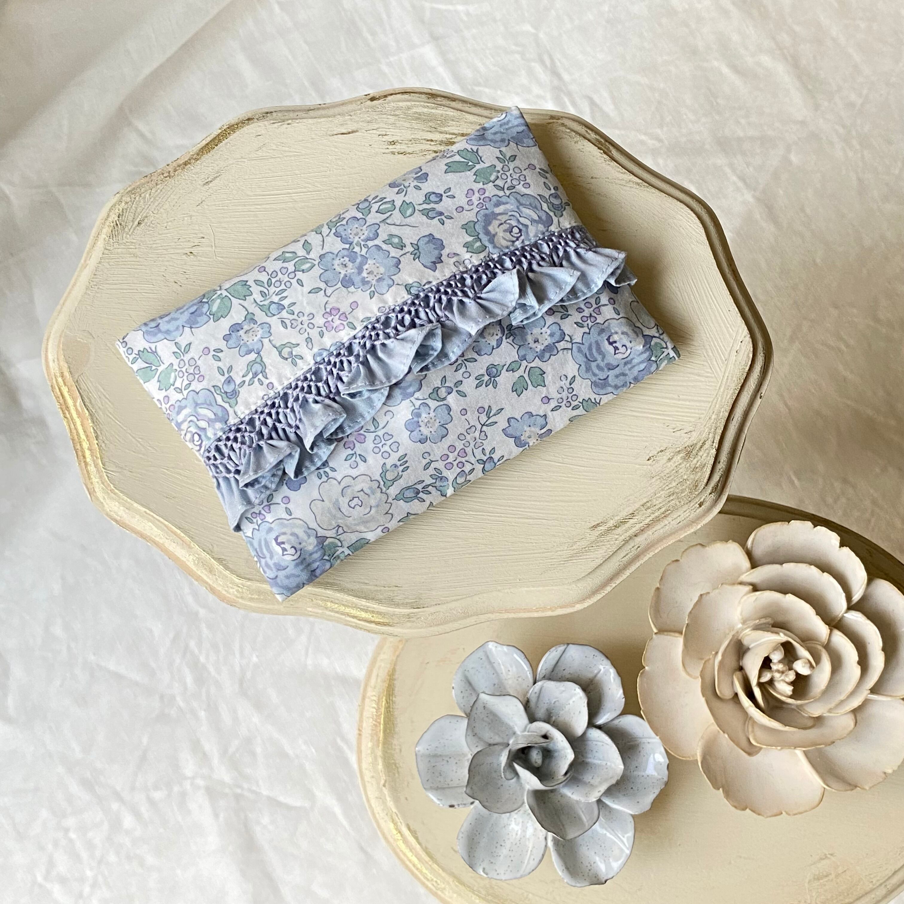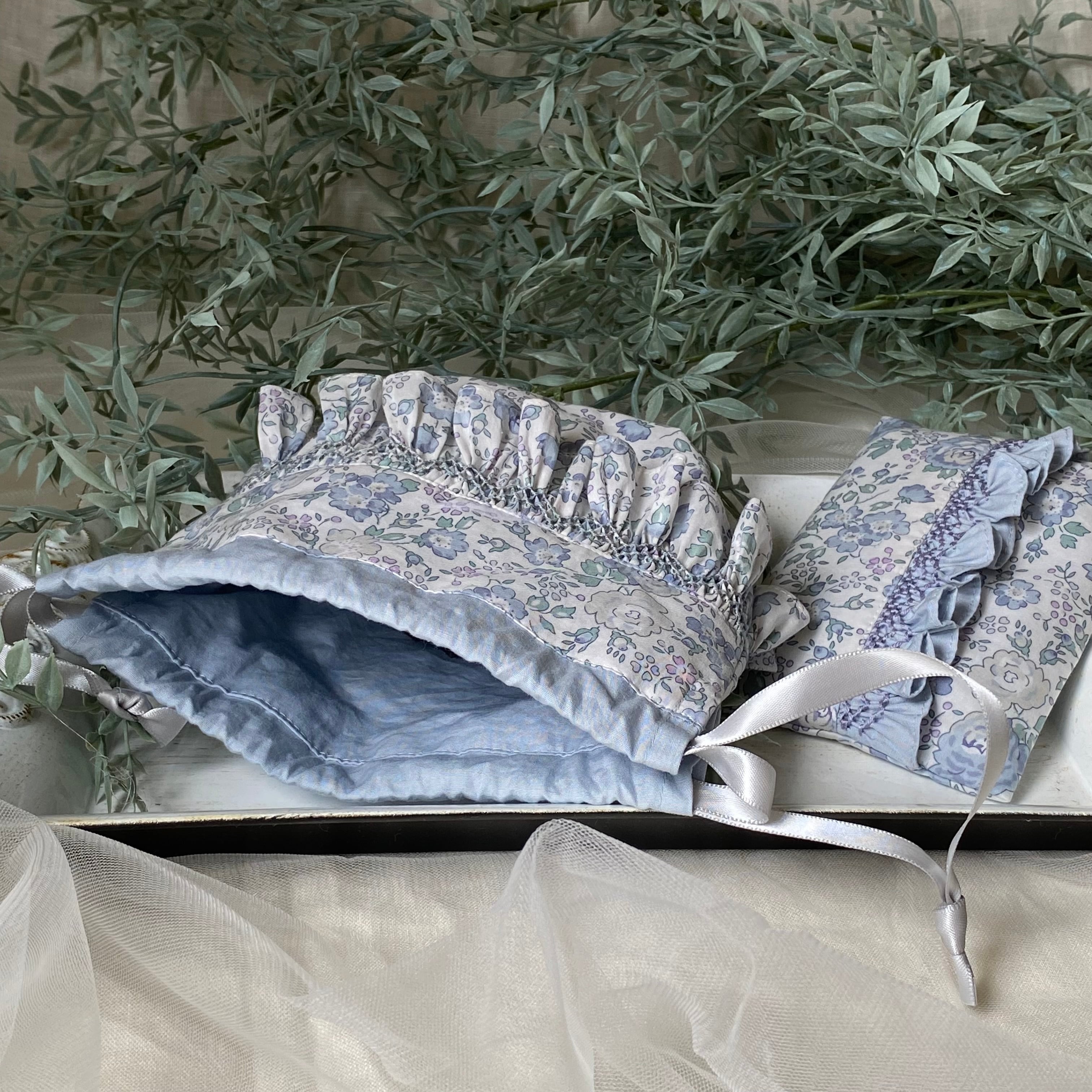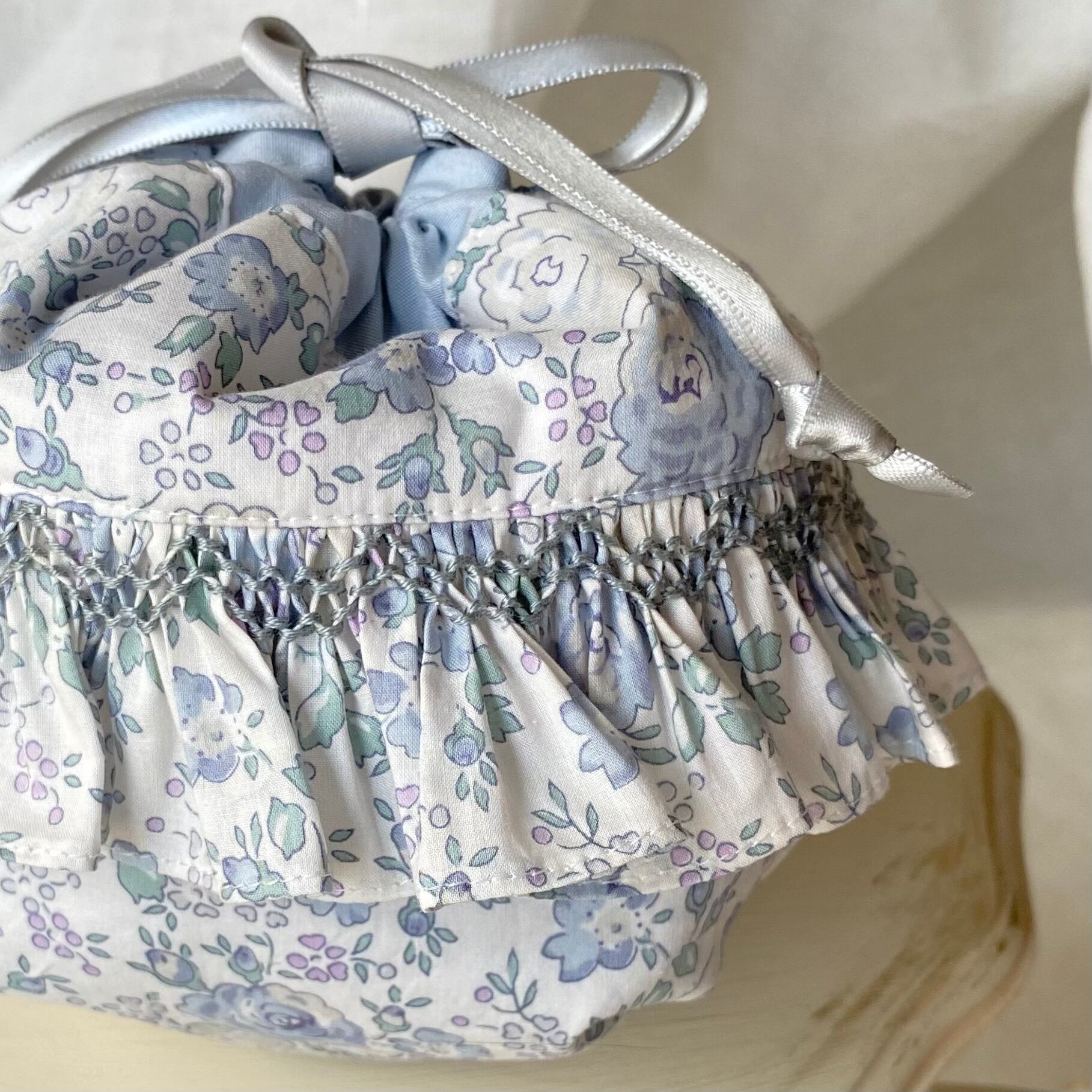 スモッキング刺繍のフリルが可愛いリバティまんまる巾着【フェリシテブルー】